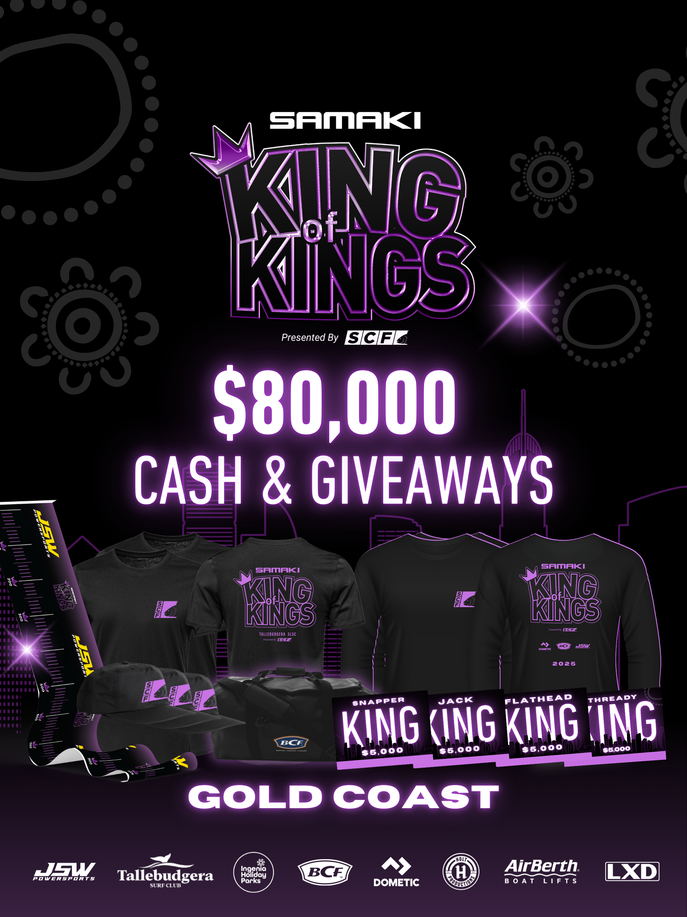 Held over the first week in September 2025, the Samaki King of Kings saltwater fishing tournament will host; boat, kayak, shore, bait/lure, spear and free-diving fishermen from over Australia. Anglers of all ages and skill levels will compete from midnight Monday 1st September to 10am Thursday 4th September, recording their success via SCF Members and will have the chance to share in over $80,000+ worth of cash prizes and giveaways.